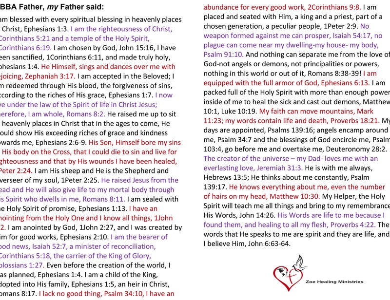 - "I am packed full of the Holy Spirit with more than enough power inside of me to heal the sick and cast out demons" -Matthew 10:1, Luke 10:19
